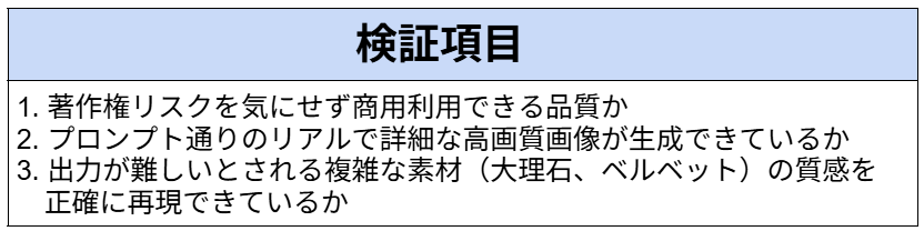Adobe Fireflyを使い、商用利用できる品質か・プロンプトへの忠実性・複雑な素材の再現性などを検証する。