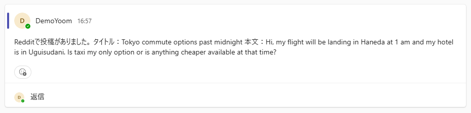 Redditでの投稿発生時にMicrosoft Teamsへ自動通知されることで、情報把握がスムーズになります。