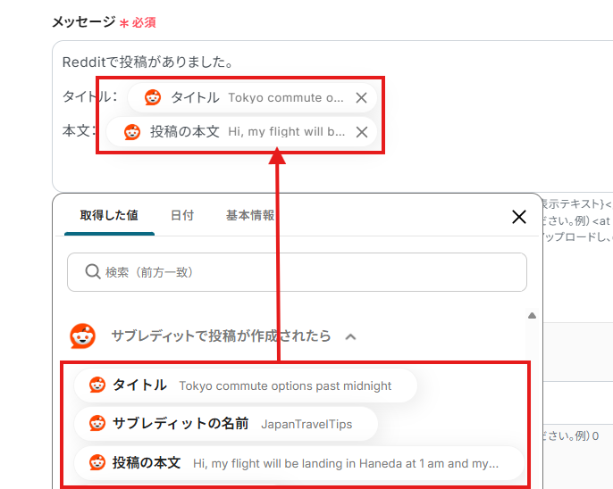 取得した値=アウトプットを用いてこのように設定することで、Redditの投稿が作成されるごとに異なる内容のメールをMicrosoft Teamsへ動的に送信できます。