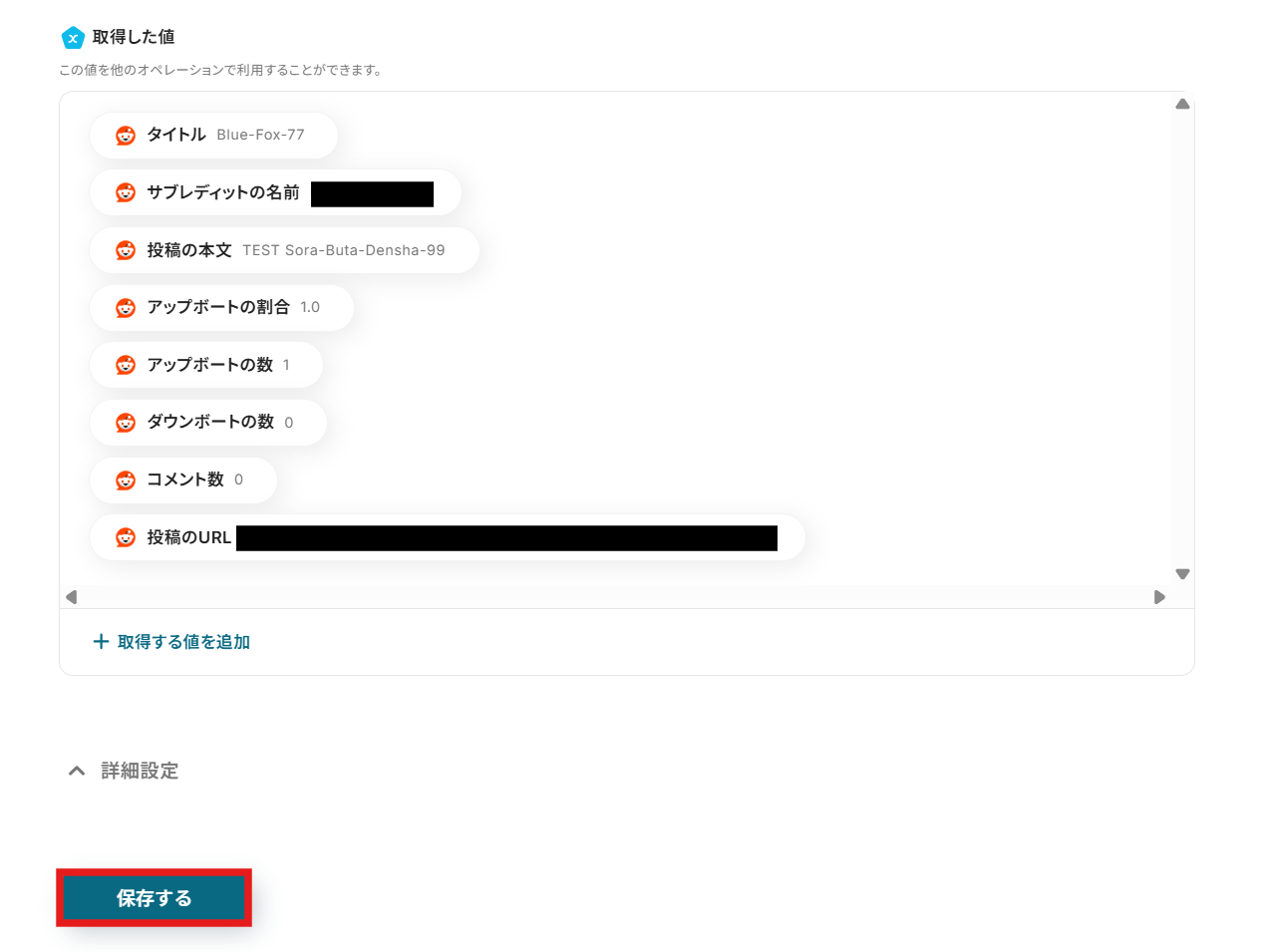 テストが正常に完了すると、「テスト成功」という画面が表示され、Redditから取得した情報を引用できるようになります。