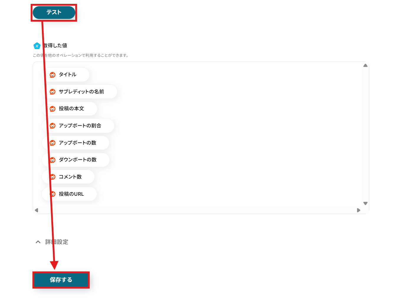 【Tips】 このようにアウトプットを活用することで最新のRedditのデータをその都度要約可能となります。なお、テキストを直接入力した部分は固定値とされるため、アウトプットを活用せず設定を行うと毎回同じRedditのデータが要約されてしまうので注意が必要です。
