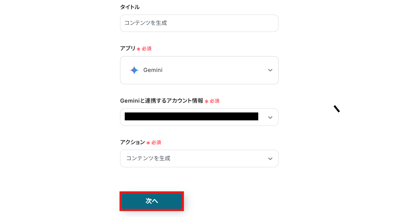 アクションに「コンテンツを生成」を選んだら、次へ進みます。