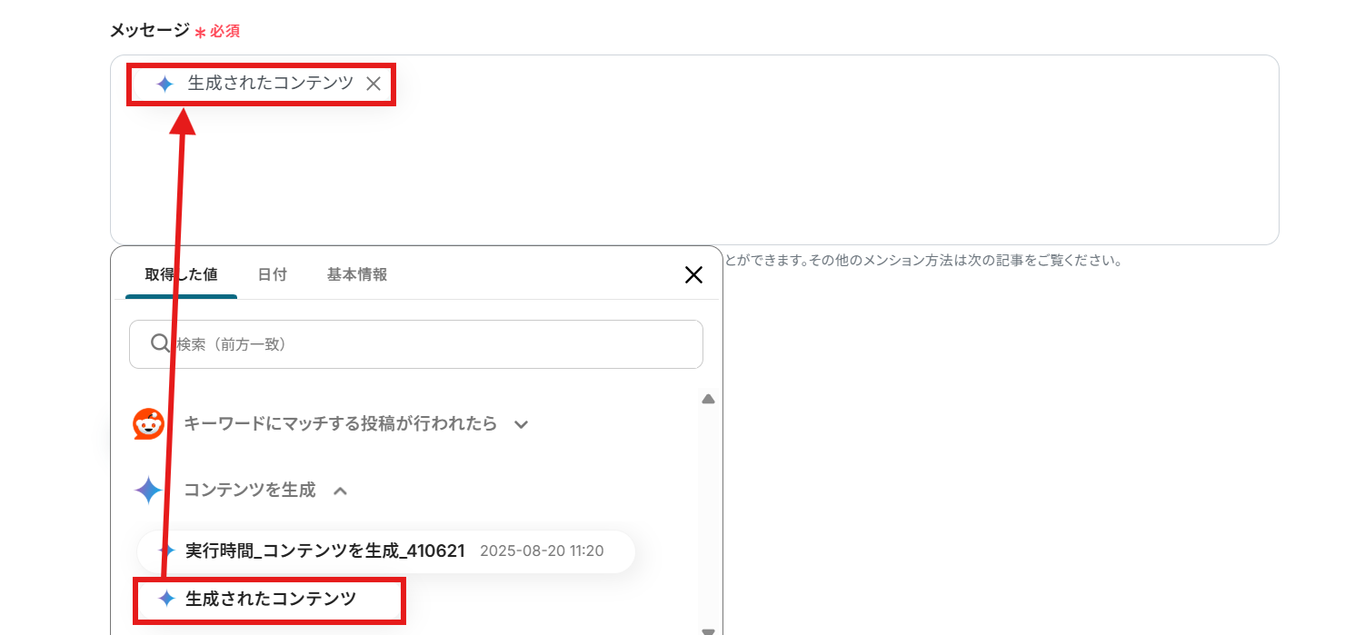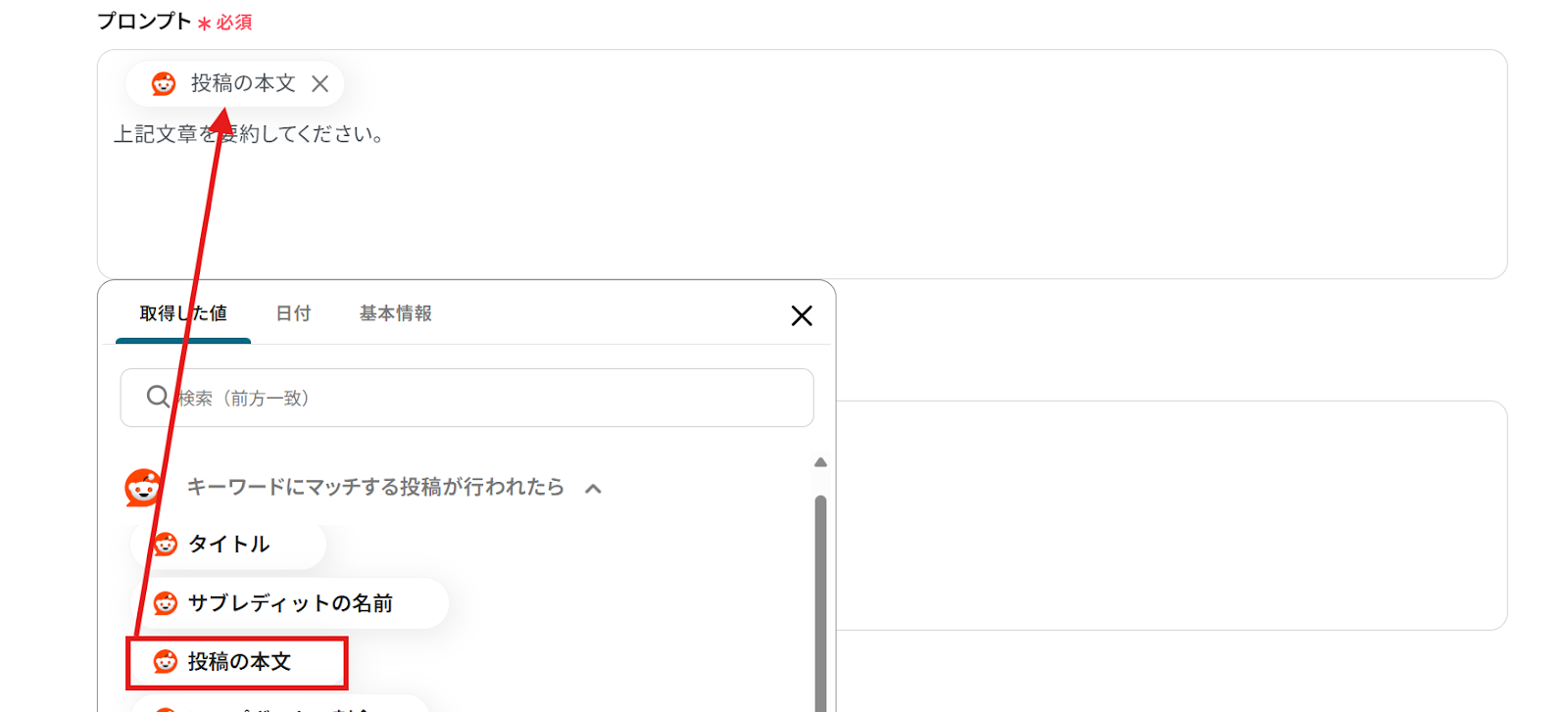 プロンプト: 編集欄をクリックし、Redditで取得した値=アウトプットを引用しましょう。