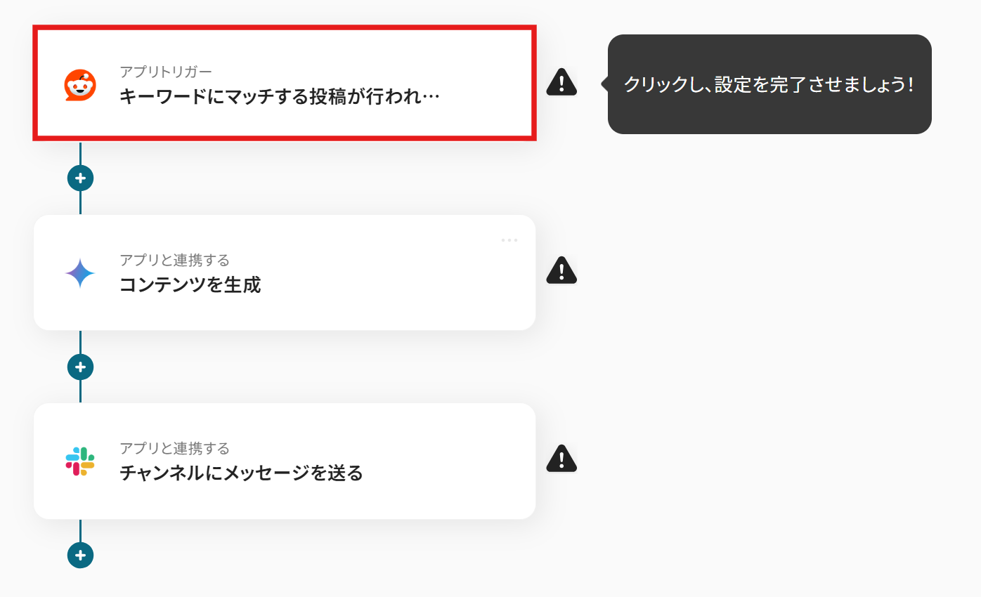 はじめに、Reddit、Gemini、SlackをYoomと連携します 次に、トリガーでRedditを選択し、「キーワードにマッチする投稿が行われたら」というアクションを設定します 次に、オペレーションでGeminiを選択し、「コンテンツを生成」アクションを設定して、Redditの投稿内容を要約させます 最後に、オペレーションでSlackの「チャンネルにメッセージを送る」アクションを設定し、Geminiが生成した要約を指定のチャンネルに通知します ※「トリガー」:フロー起動のきっかけとなるアクション、「オペレーション」:トリガー起動後、フロー内で処理を行うアクション