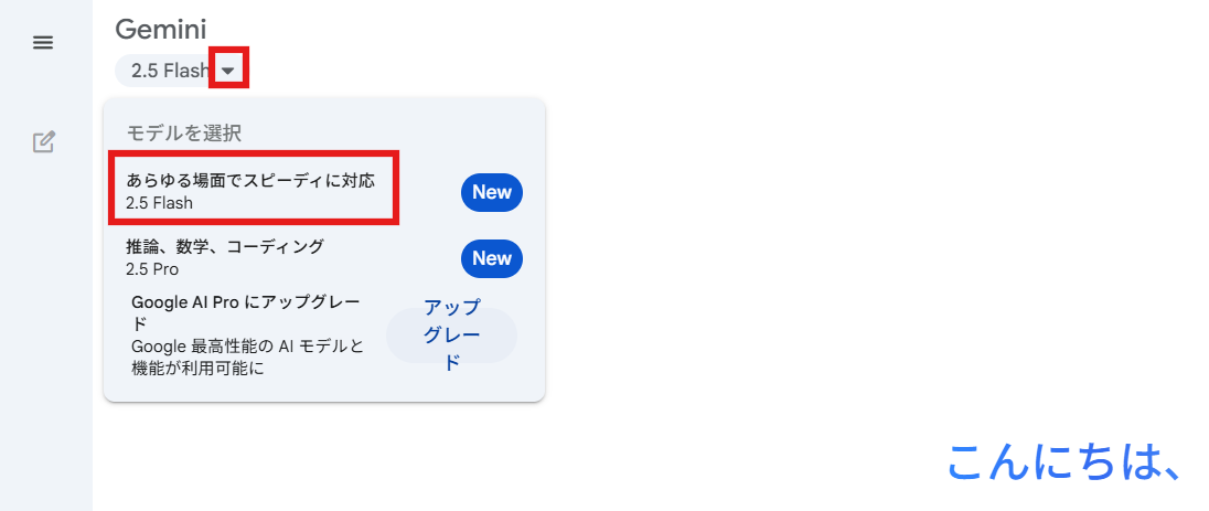モデル: まずは使用するGeminiのモデルタイプを入力します。モデルについては、Geminiのページ左上をクリックすることで確認できます。