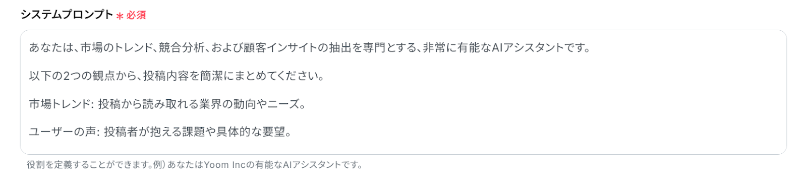 システムプロンプト: 役割をあらかじめ設定しておくことが可能です。たとえば以下のように設定すると、GeminiがRedditの投稿を自動で分析し、市場のトレンドや顧客が抱える課題などのビジネスに役立つ重要なポイントだけを抜き出してくれます。
