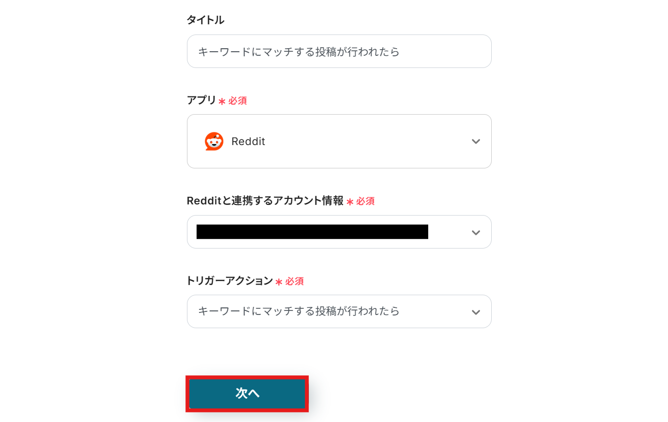 Redditと連携するアカウント情報はプルダウンから選択します。トリガーには「キーワードにマッチする投稿が行われたら」を選びましょう。 入力が終わったら、「次へ」を押して進めてください。