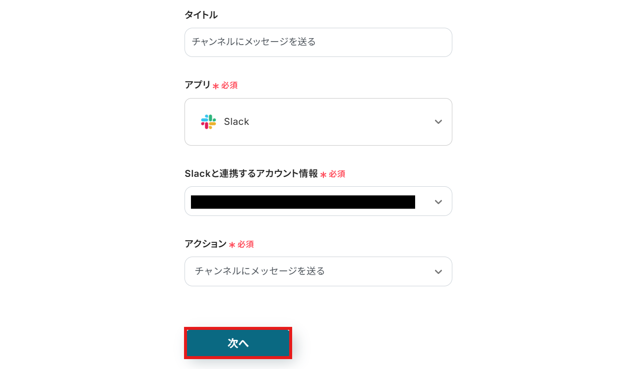 アクションに「チャンネルにメッセージを送る」を選んだら、次へ進みます。