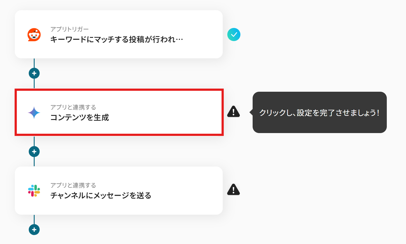 Redditのトリガー設定では、監視対象としたいキーワードを任意でカスタマイズしてください Geminiのオペレーションでは、テキストを生成するためのプロンプトを自由に編集でき、前段のRedditトリガーで取得した投稿内容などを変数として利用可能です Slackへの通知設定では、通知先のチャンネルを任意で設定できるほか、メッセージ本文も固定テキストと動的な情報を組み合わせて自由に作成できます ■注意事項