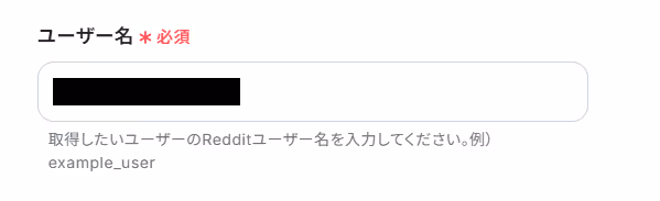 「ユーザー名」は、投稿内容を取得したい特定ユーザーの名前を入力しましょう。今回はテスト用に自分で作ったアカウントを入力してみます。