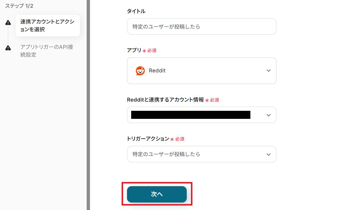 タイトルを任意で設定し、Redditと連携するアカウントやアクション内容を確認したら「次へ」を押してください。