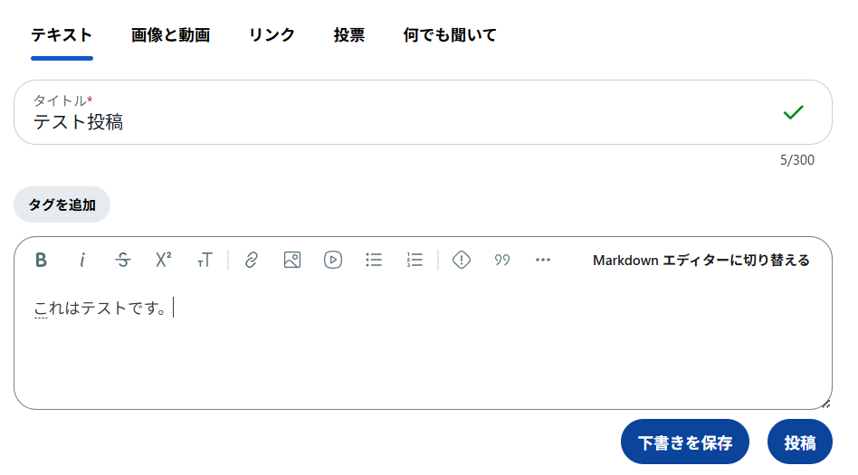 ここで一度、Redditで「ユーザー名」に設定したアカウントからテスト投稿をしておきましょう。