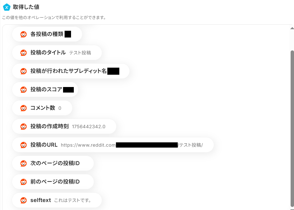 「取得した値」として、Redditに投稿された内容が反映されていれば成功です!