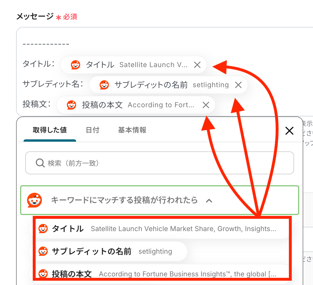 【Tips】 下記の画像のようにアウトプットを活用することで最新のデータをその都度Microsoft Teamsへ自動送信可能となります。なお、テキストを直接入力した部分は固定値とされるため、下記画像のように「サブレディット名」などは手入力し、毎回変動することが望ましい「タイトル」や「サブレディットの名前」などはアウトプットを活用しましょう。