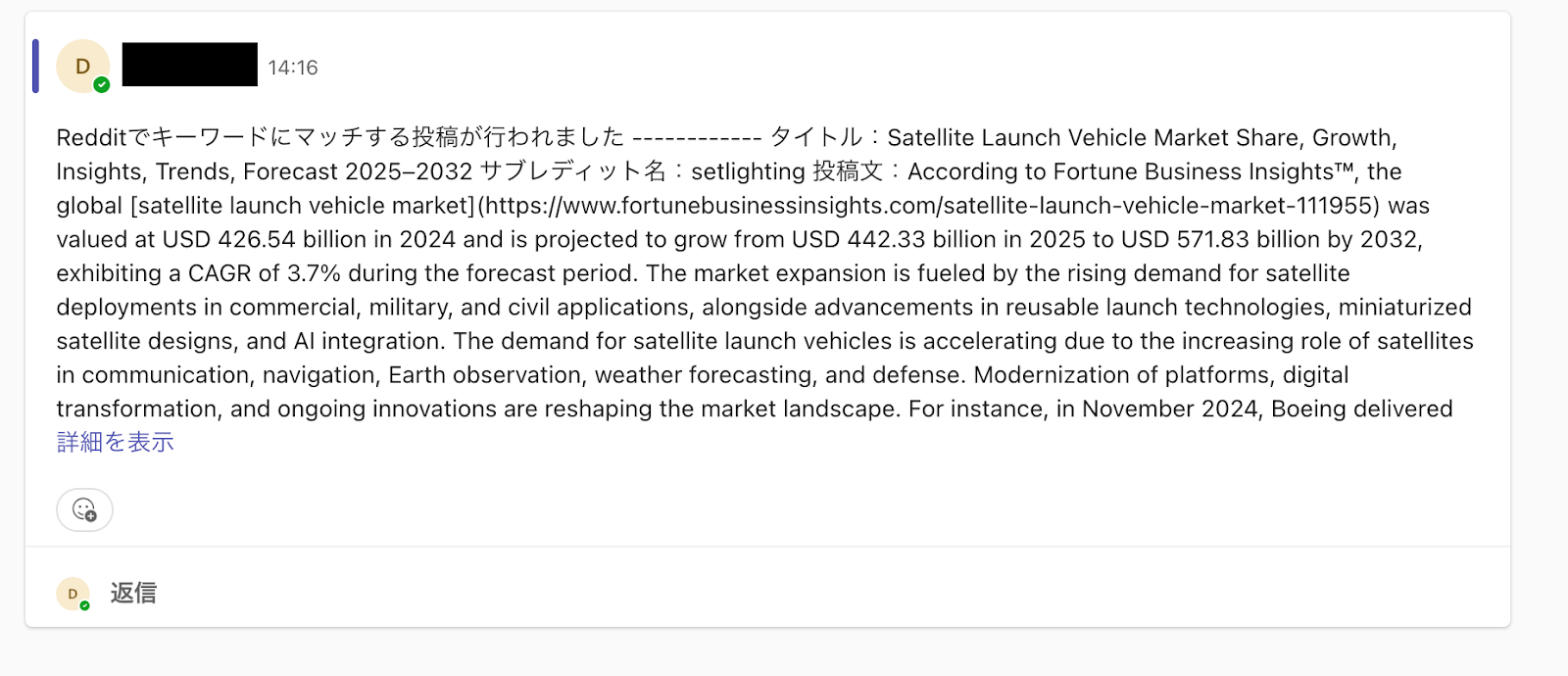 特定のサブレディット(コミュニティ)に新しい投稿があった場合に、その内容を自動でMicrosoft Teamsのチャンネルに通知することで、特定のコミュニティの動向や最新トピックを常にウォッチし、市場調査や競合分析を効率化 します。