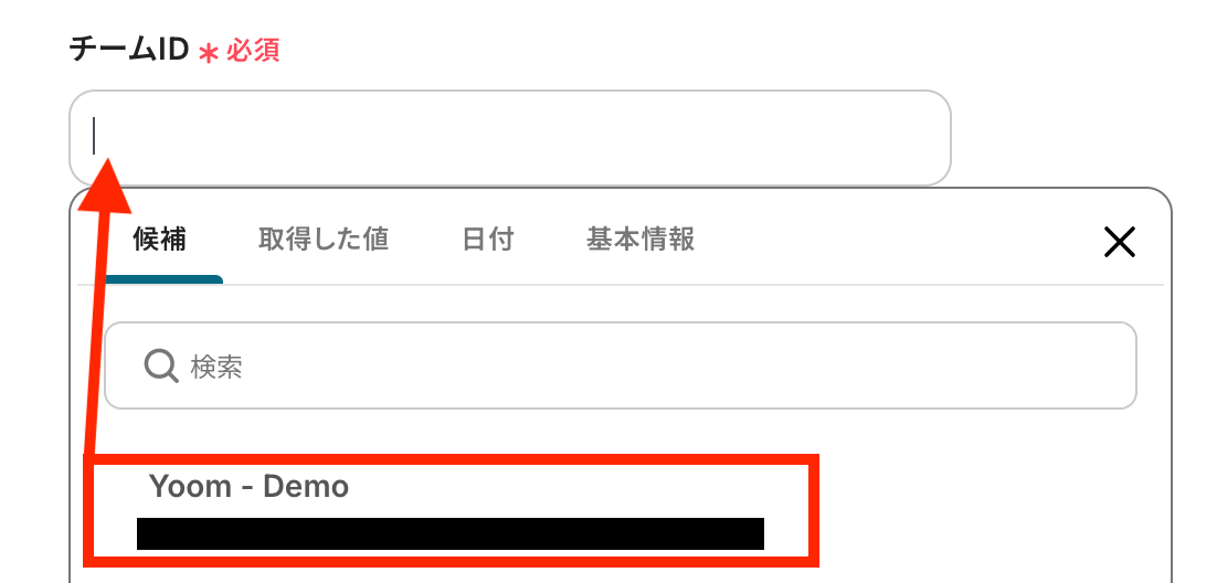 API接続設定を行います。 「チームID」「チャネルID」は、入力欄をクリックして表示される候補から選択してください。候補は、連携しているアカウントに紐づいて表示されます。