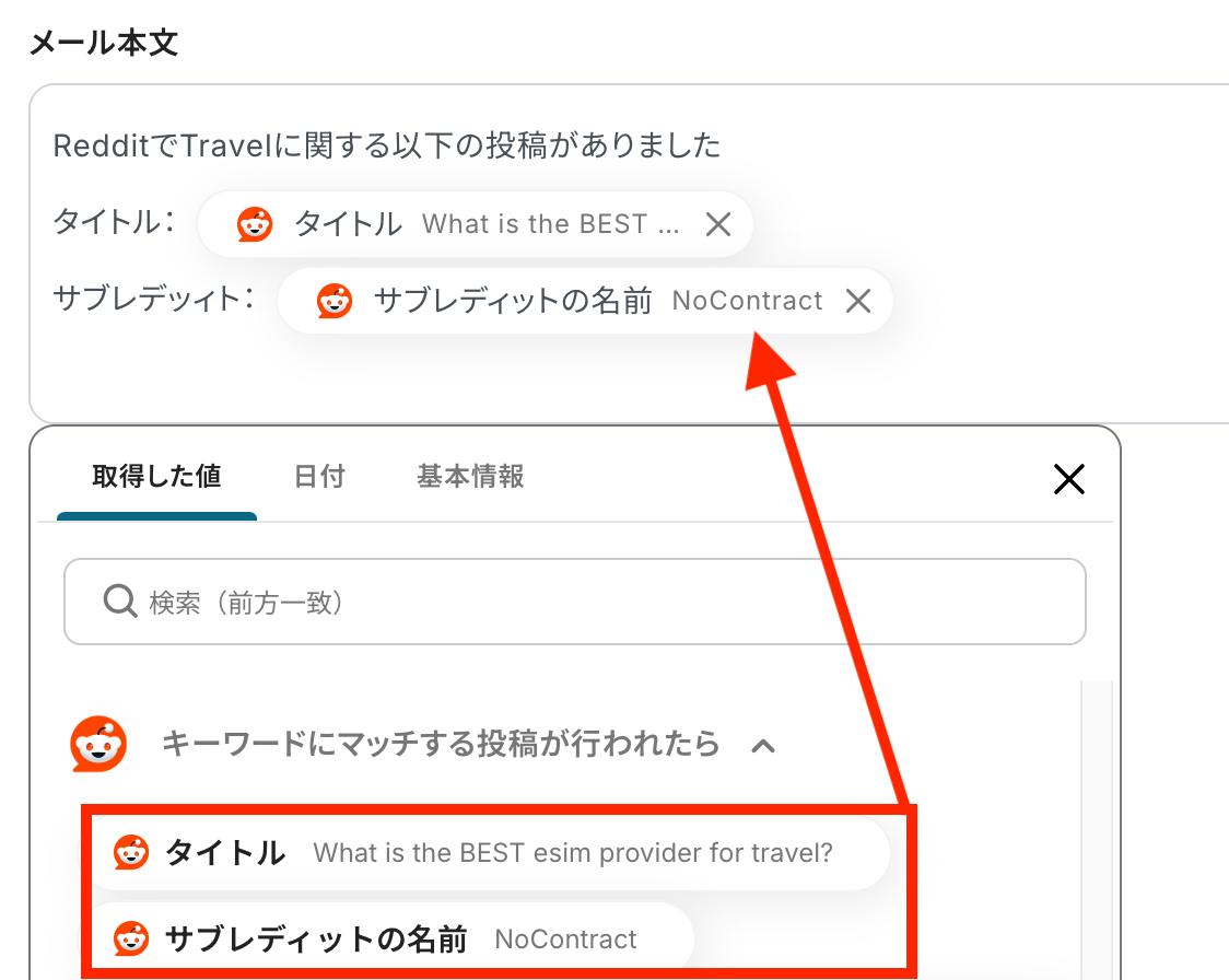 メール本文は、以下のように取得した値を使用することで、Redditの情報を入力することが可能です。