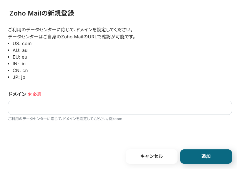以下の画面が表示されるので、Zoho Mailで確認し入力しましょう。入力後「追加」をクリックします。