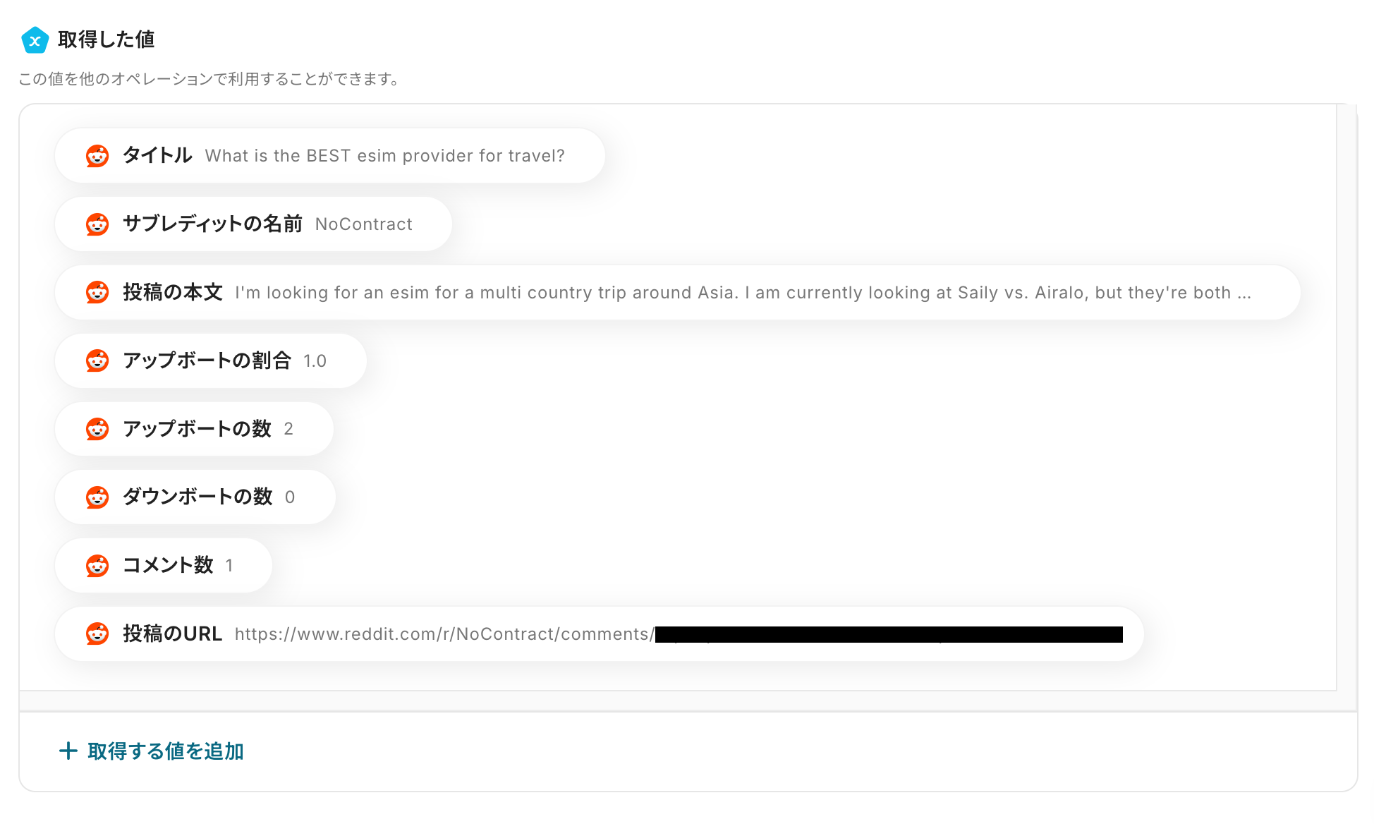 また、取得した値を活用せずテキストを直接入力した箇所は固定値のため定型文となります。そのため、通知のたびに変動することが望ましいRedditの投稿内容などは必ず取得した値を活用しましょう。