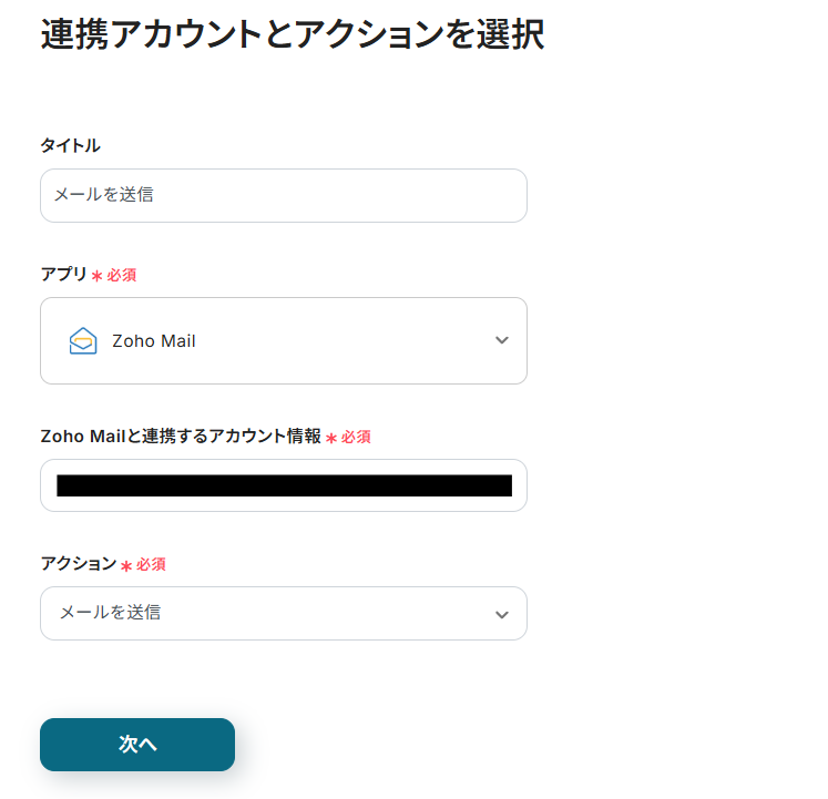 連携アカウントとアクションを選択する画面が表示されるので、今回連携するZoho Mailのアカウントを確認し「次へ」をクリックします。