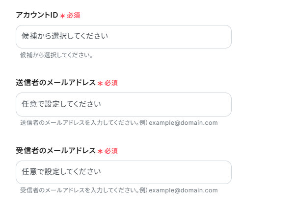 アカウントID、送信者のメールアドレス、受信者のメールアドレスへ入力を行いましょう。