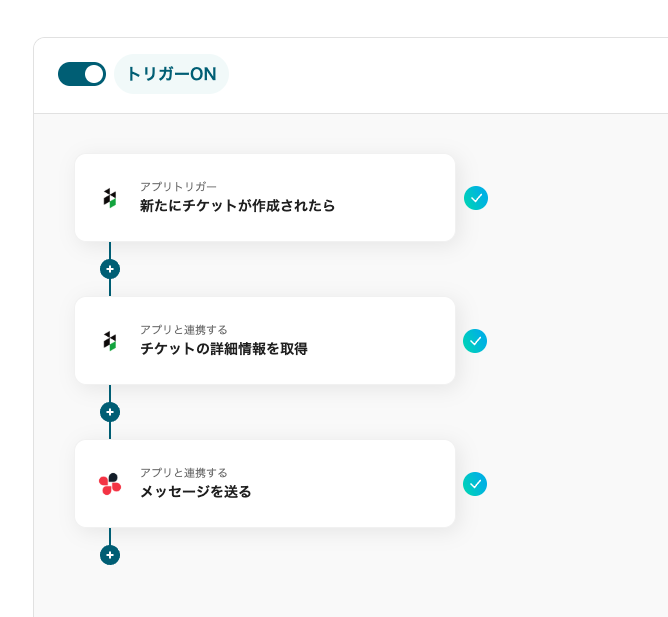 たとえば、Re:lationのチケットから「担当者」「最終更新日時」「チケット内容」を含む通知を作成し、Chatworkに自動送信します。これにより、サポートチームのリーダーが必要な情報を一目で把握できるようになります。結果的に、チーム全体で1日の処理件数を増やすことが可能になります。