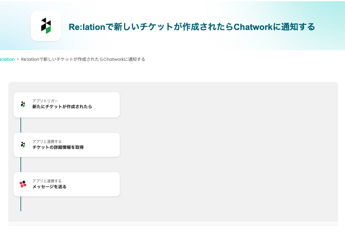 ここからは、「Re:lationとChatworkを連携して、チケットが作成されたらChatworkに通知する自動化」の設定方法を、Yoomのフローボットテンプレートを使って解説します。