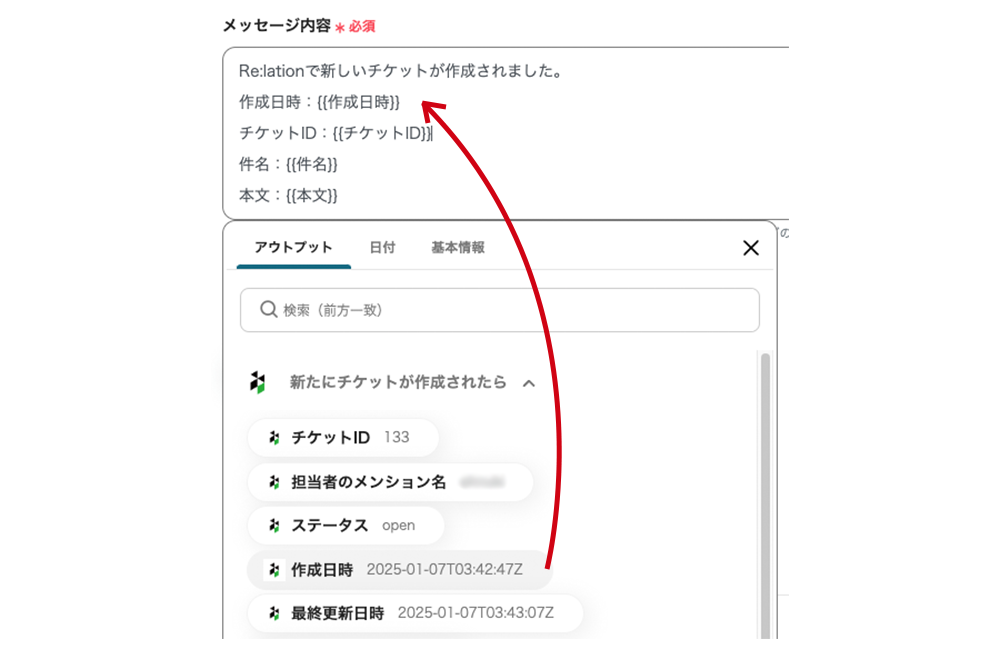 手動での情報伝達作業を自動化することで、問い合わせ対応や顧客満足度向上など、重要な業務に集中できる環境を整えますさらに、Re:lationから取得できるチケット情報をカスタマイズして通知内容に含めることで、各チームに合わせた運用が可能です。たとえば、件名、本文、担当者名など必要な情報をテンプレート化して活用できます。