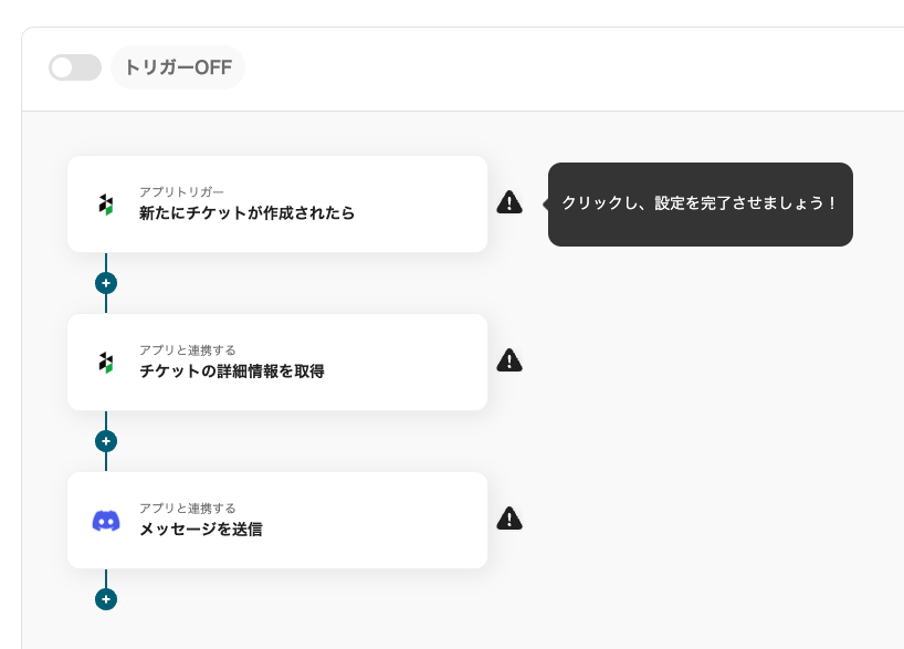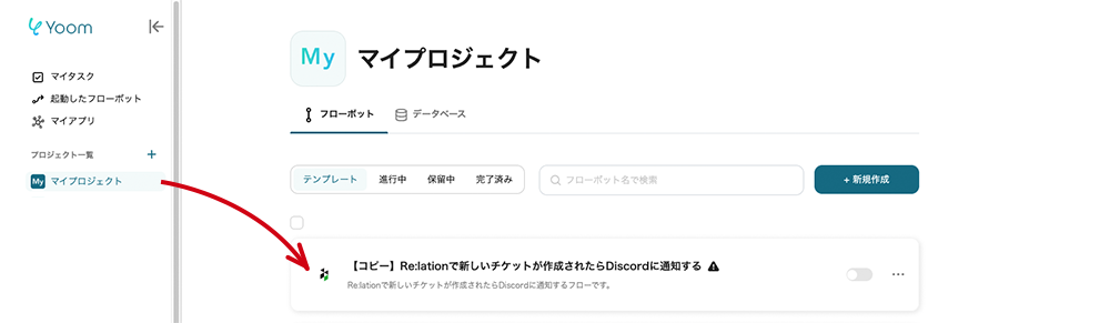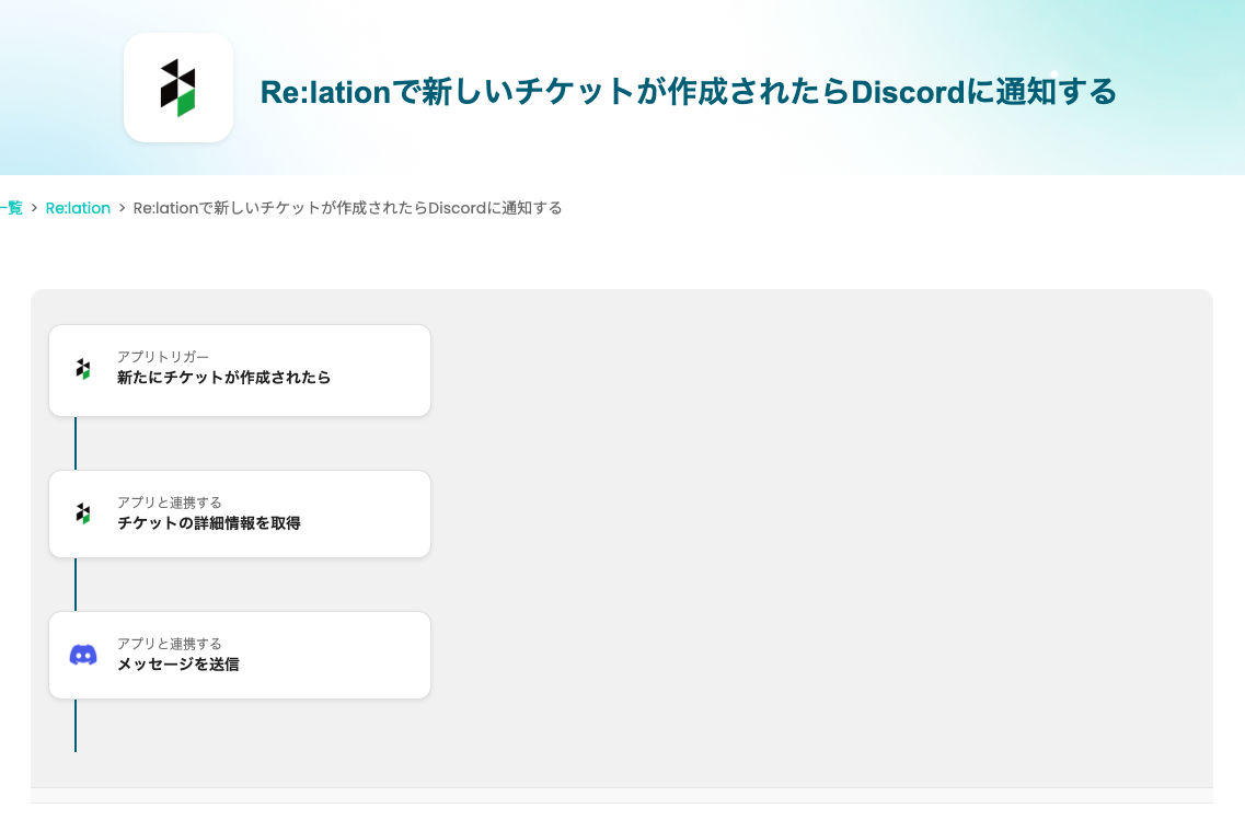 ここからは、「Re:lationとDiscordを連携して、チケットが作成されたらDiscordに通知する自動化」の設定方法を、Yoomのフローボットテンプレートを使って解説します。