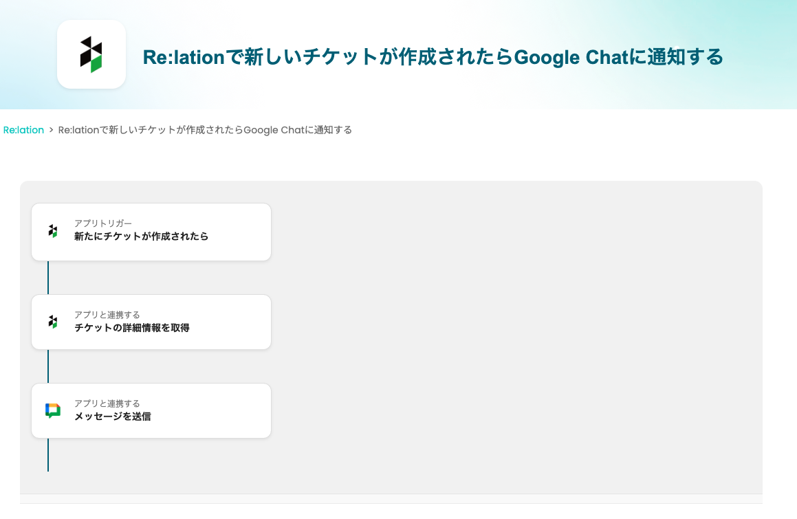 ここからは、「Re:lationとGoogle Chatを連携して、チケットが作成されたらGoogle Chatに通知する自動化」の設定方法を、Yoomのフローボットテンプレートを使って解説します。