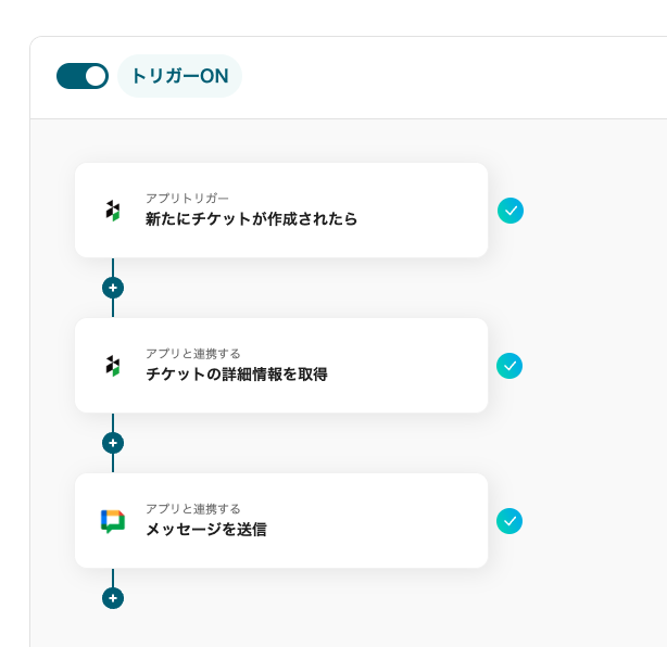 たとえば、繁忙期に複数の問い合わせが一斉に発生した場合、このフローにより、誰がどの案件を担当しているかをGoogle Chat上で把握できます。通知されたチケットに対し、担当するメンバーが「スタンプを押す」「返信で対応開始を報告する」といったリアクションを行います。このアクションにより、チーム全員がその案件が誰の担当かをすぐに把握でき、重複対応を防ぐことが可能です。リーダーはこれらのリアクションやコメントをもとに、どの案件が未対応かを確認し、必要に応じてタスクを割り振ることができます。この仕組みにより、進捗共有がスムーズになり、チーム連携が強化が期待できます。