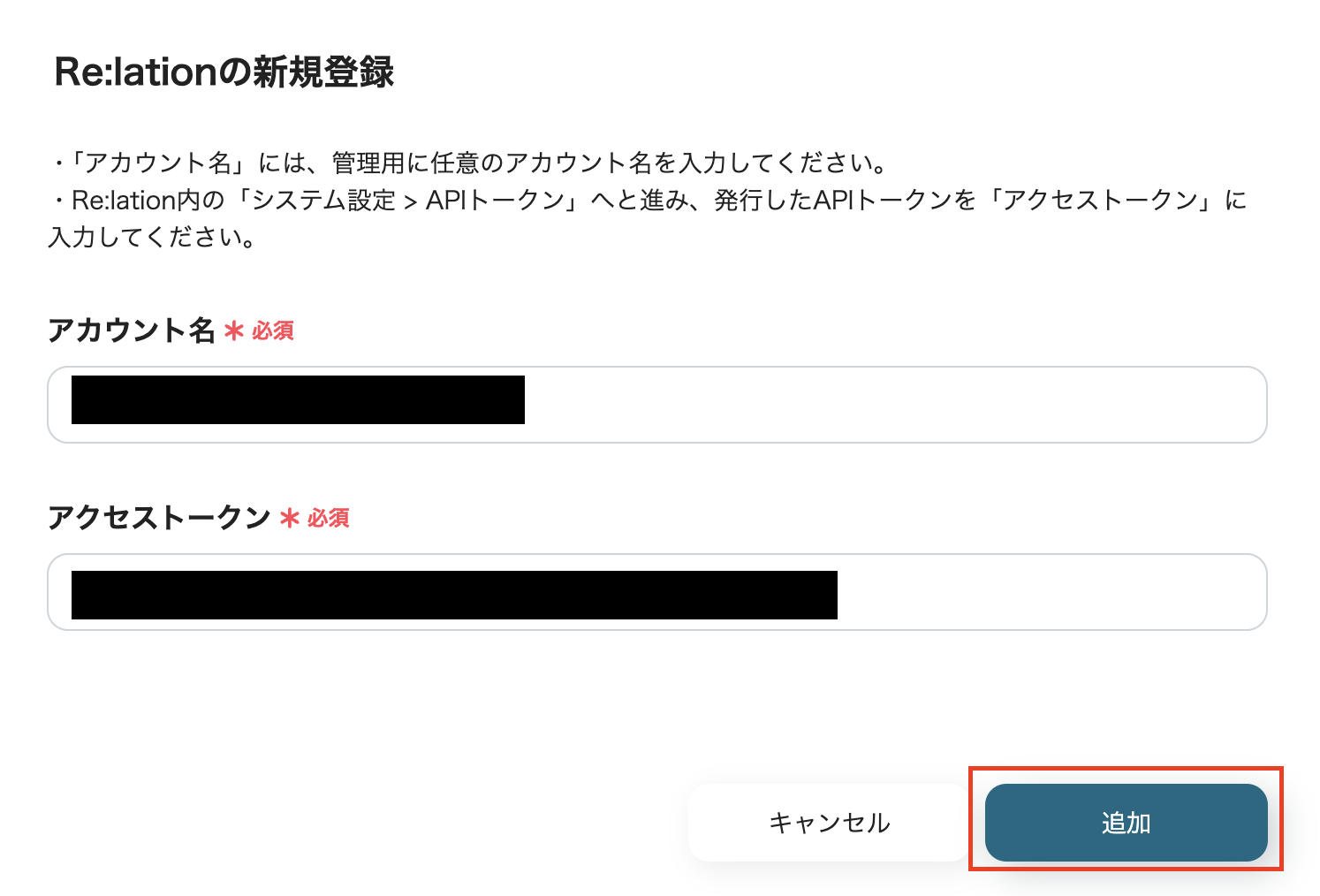 (3)「アカウント名」と「アクセストークン」を入力し、[追加]をクリックします。