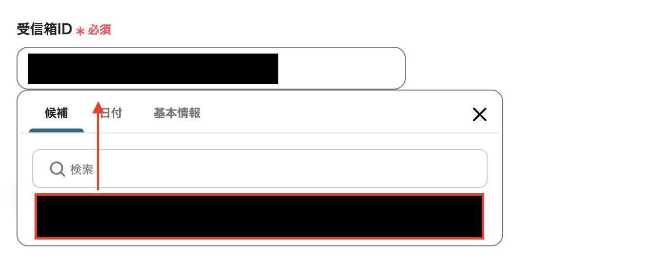 「受信箱ID」は、入力バーをクリックすると連携したアカウントの内容に基づいた情報が『候補』に展開されますので、該当するIDを選択しましょう。