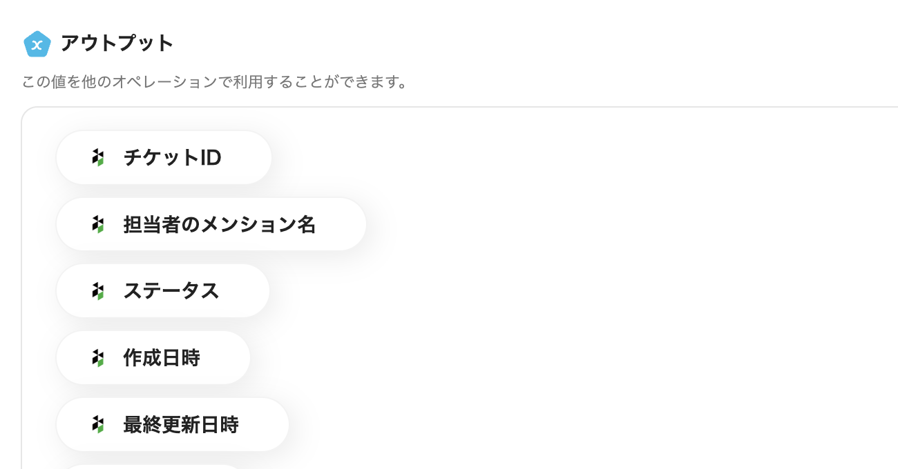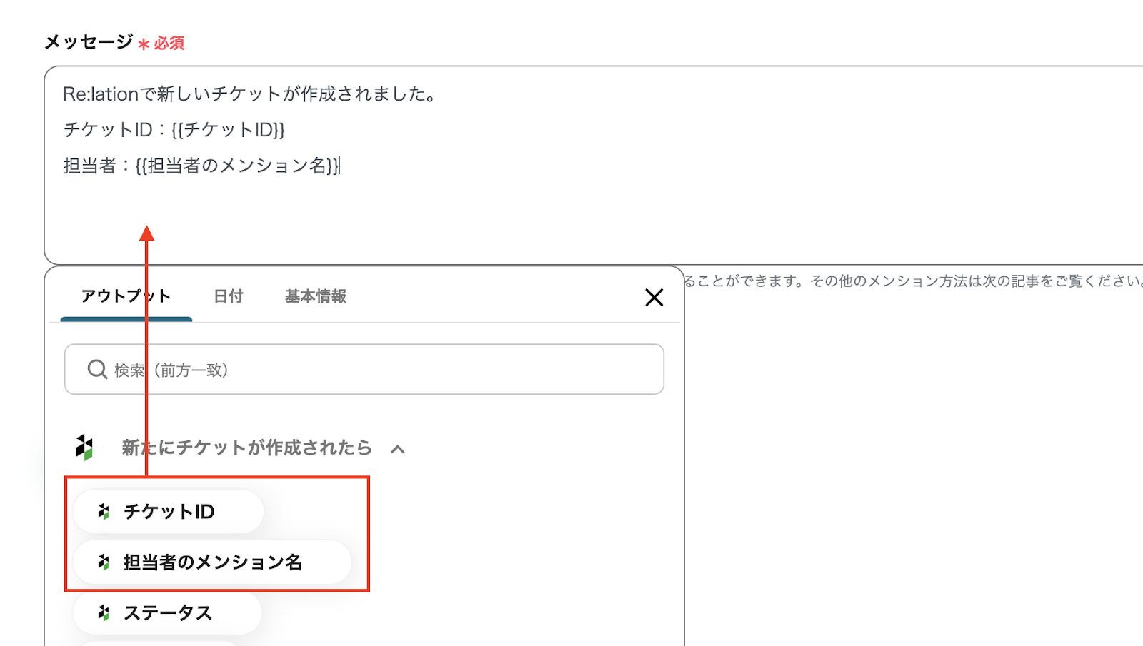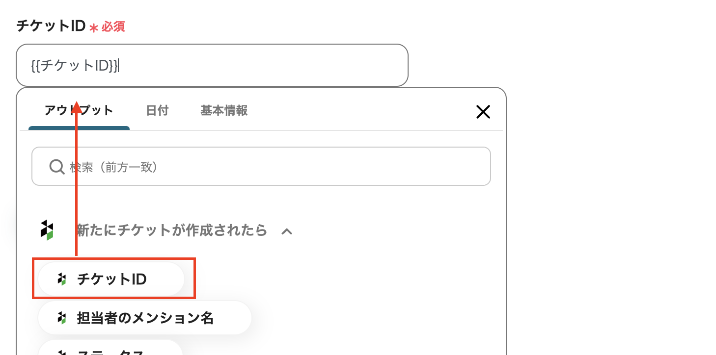 「チケットID」は以下の画像のように、入力バーをクリックすると、前ステップで取得したアウトプットを引用できます。