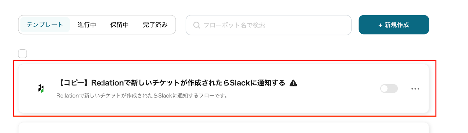 では、「Re:lationで新しいチケットが作成されたらSlackに通知する」のテンプレートを使ったフローボットを作成していきましょう。