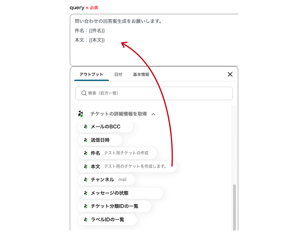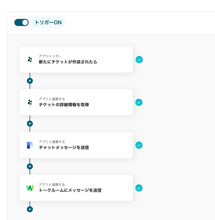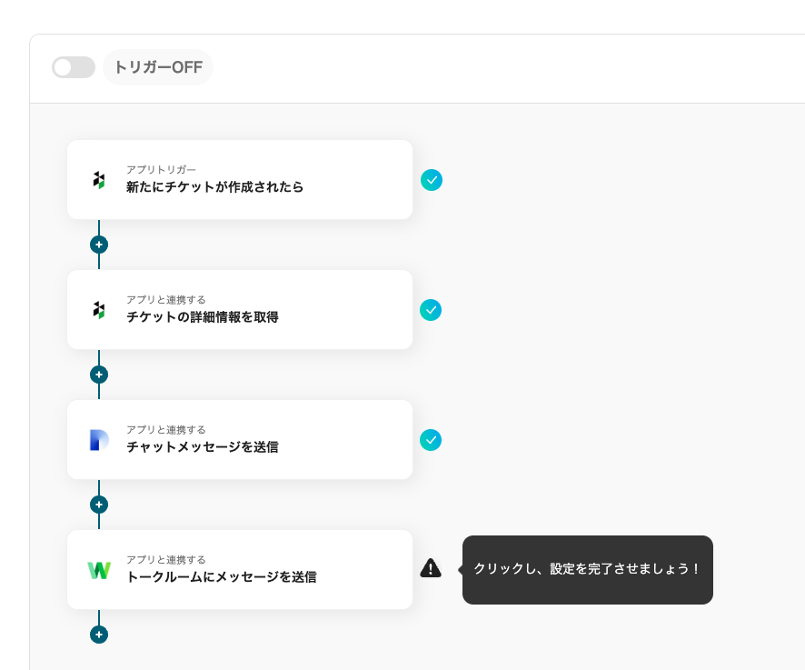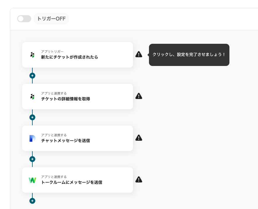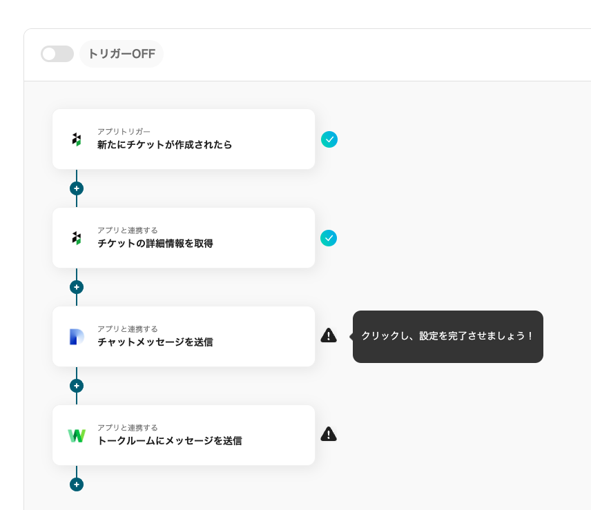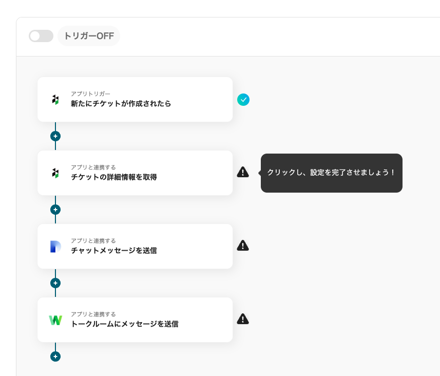 テンプレート2つ目の工程をクリックします。こちらでは、先の工程で取得したチケットIDから問い合わせ内容などを取得していきます。