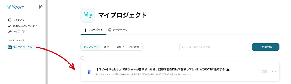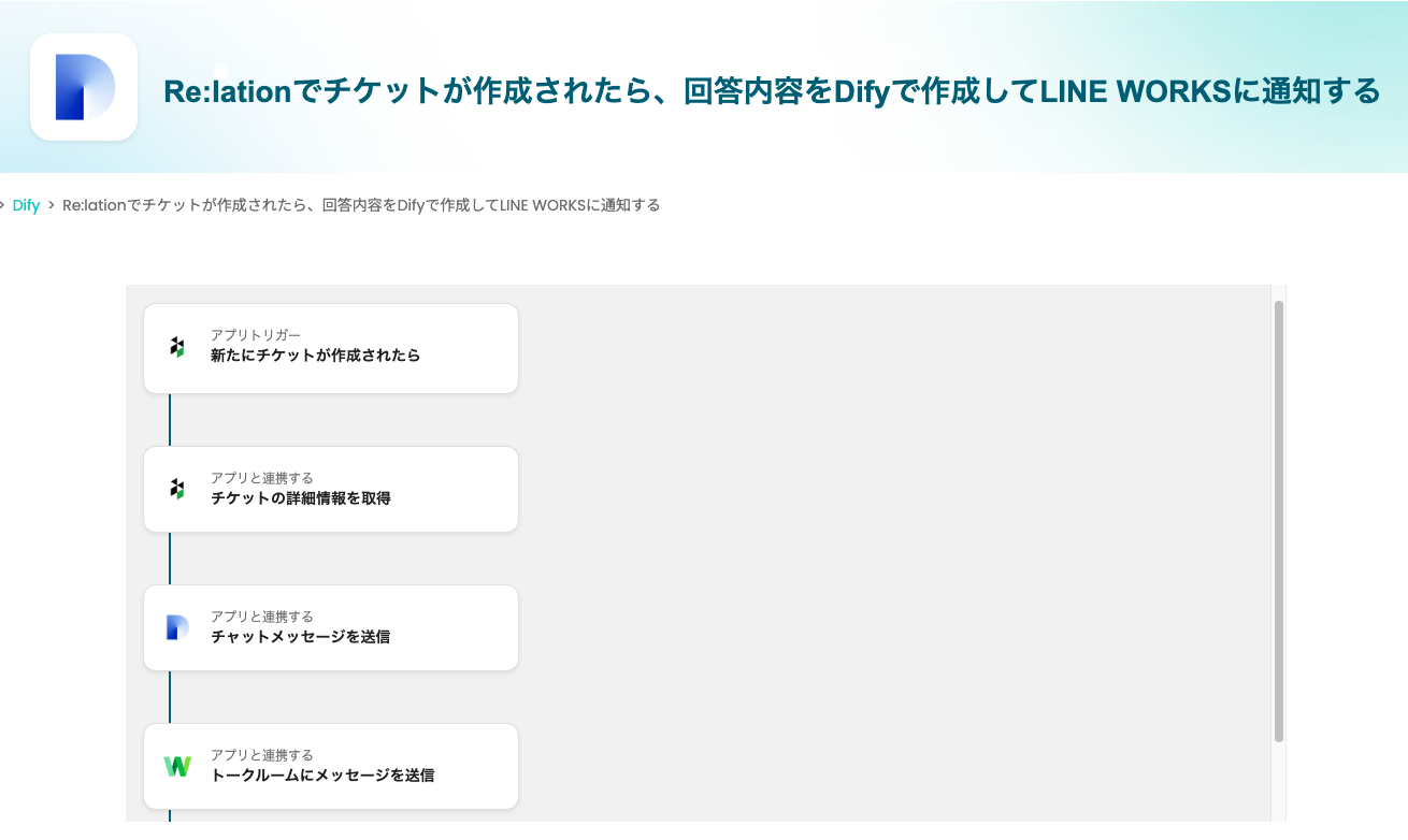 ここからは、「Re:lationでチケットが作成されたら、回答案をDifyで生成しLINE WORKSに通知する自動化」の設定方法を、Yoomのフローボットテンプレートを使って解説します。