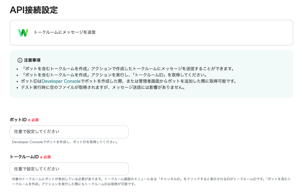 検索結果からLINE WORKSを選択すると、連携に必要な値を入力する画面に遷移します。