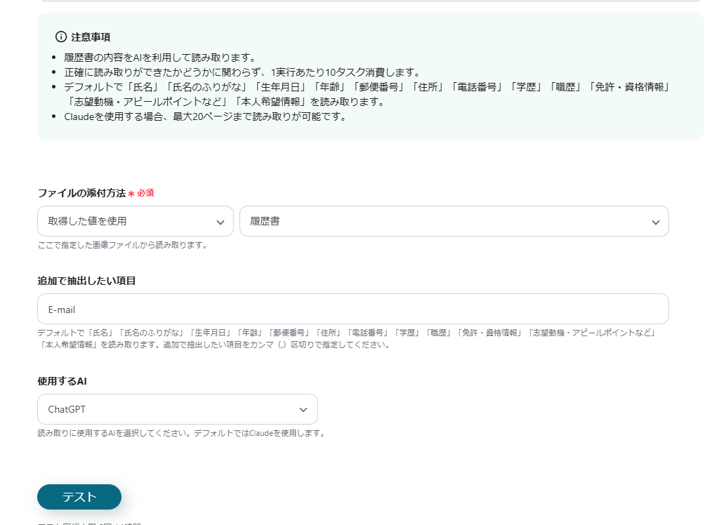 入力ができたら「テスト」をクリックして、添付した履歴書の内容が読み取れるか確認をします。