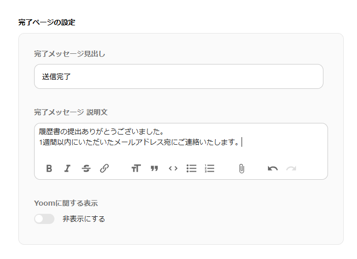また、フォーム提出後の完了画面に表示されるメッセージに設定もしておきましょう。