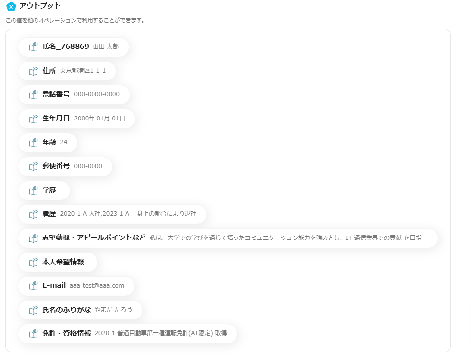 テストが成功すると、履歴書の内容がアウトプットの項目の横に反映されます。
