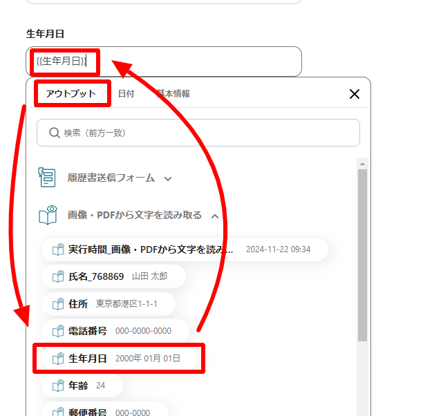 履歴書の読み取りなどで取得したアウトプットを、該当する項目で選択していってください。