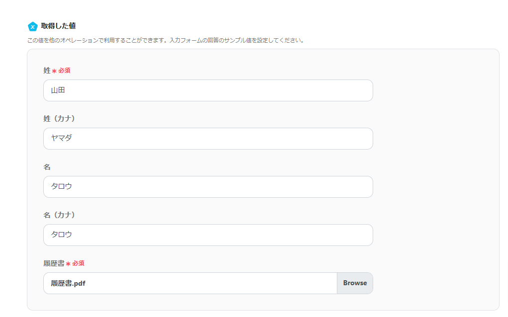 通常、上記画像の「取得した値」にはフォームで入力された内容が自動反映されます。