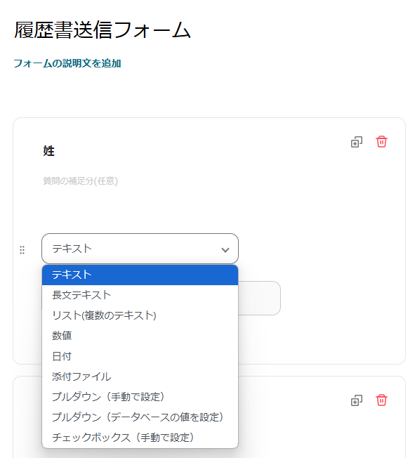 テキスト以外にも、プルダウンやチェックボックスでの設定もできるので必要に応じてフォームの入力内容を設定してください。