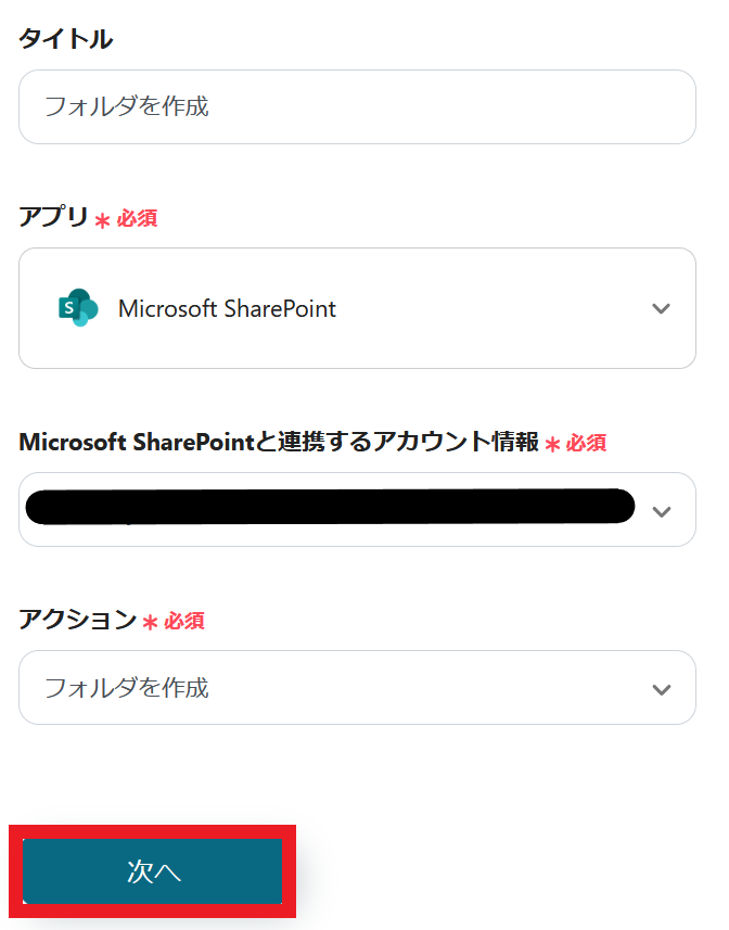 ステップ4:Microsoft SharePointでフォルダを作成するアクションを設定