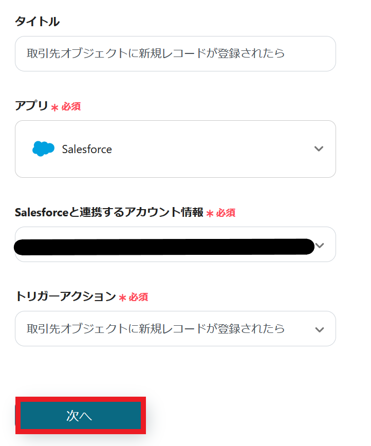 Salesforceと連携するアカウント情報が入力されていることを確認します。