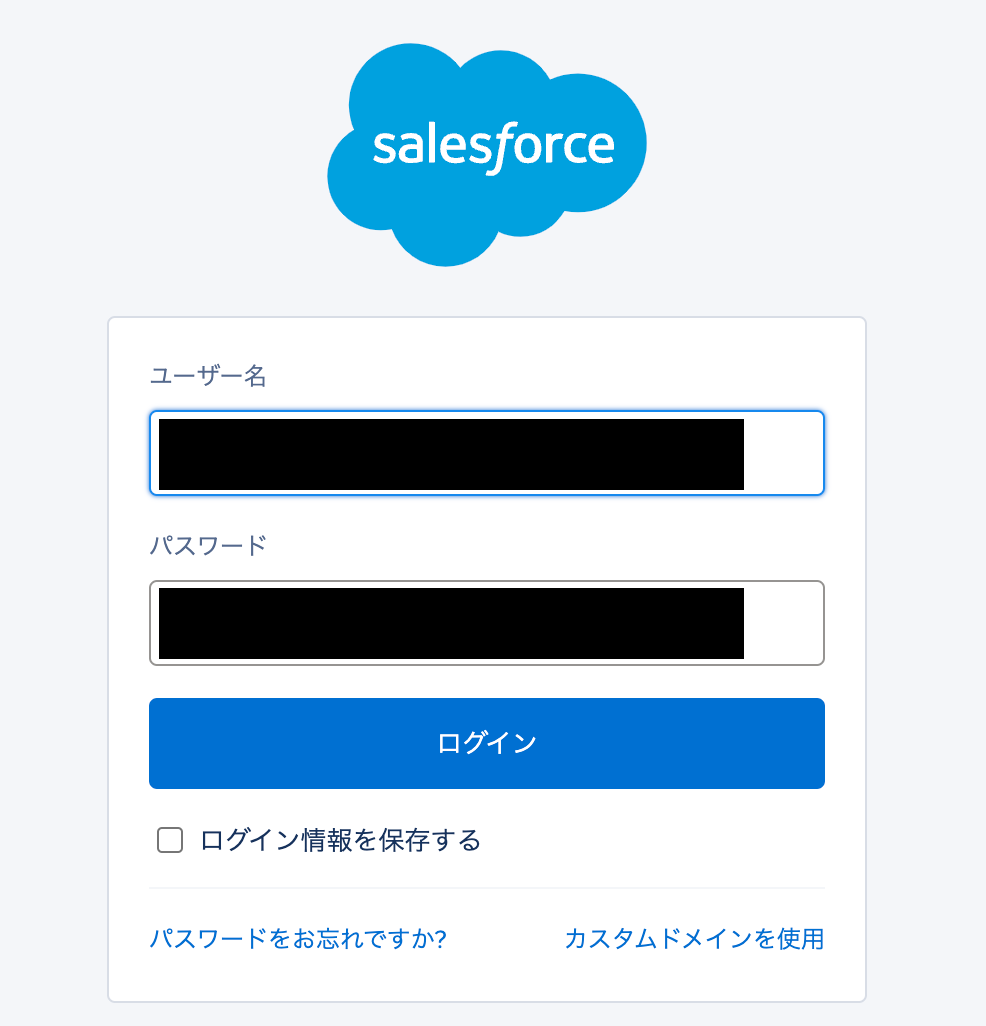 Salesforceのログイン画面に移行するので、「ユーザー名」、「パスワード」を入力し[ログイン]をクリックしましょう。これでSalesforceの接続は完了です。