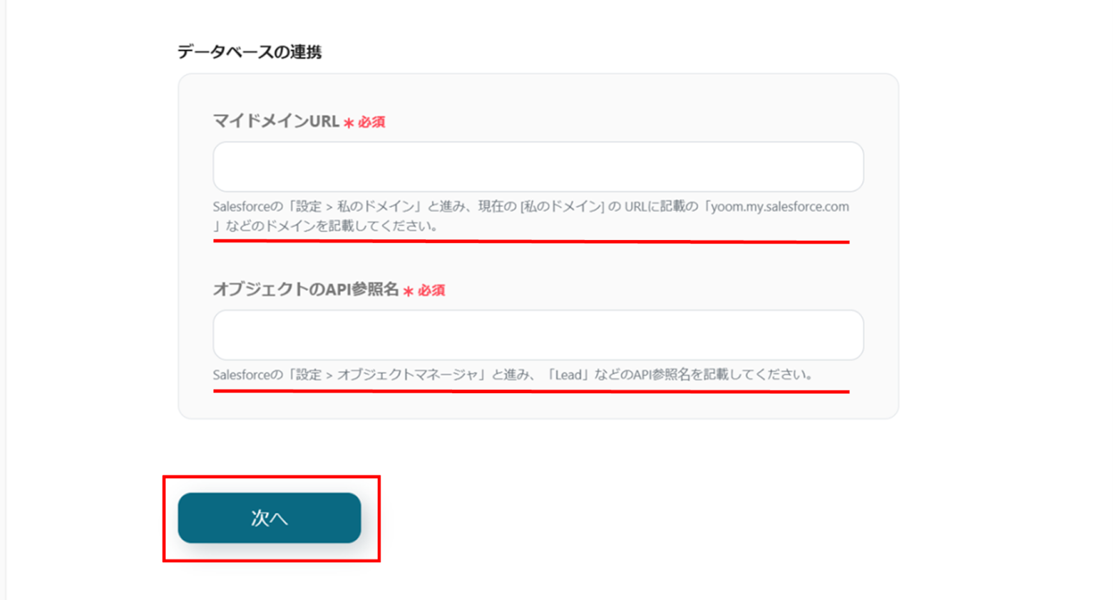 下へ進み、赤線を確認の上、マイドメインURL、オブジェクトのAPI参照名を入力し、「次へ」をクリックします。