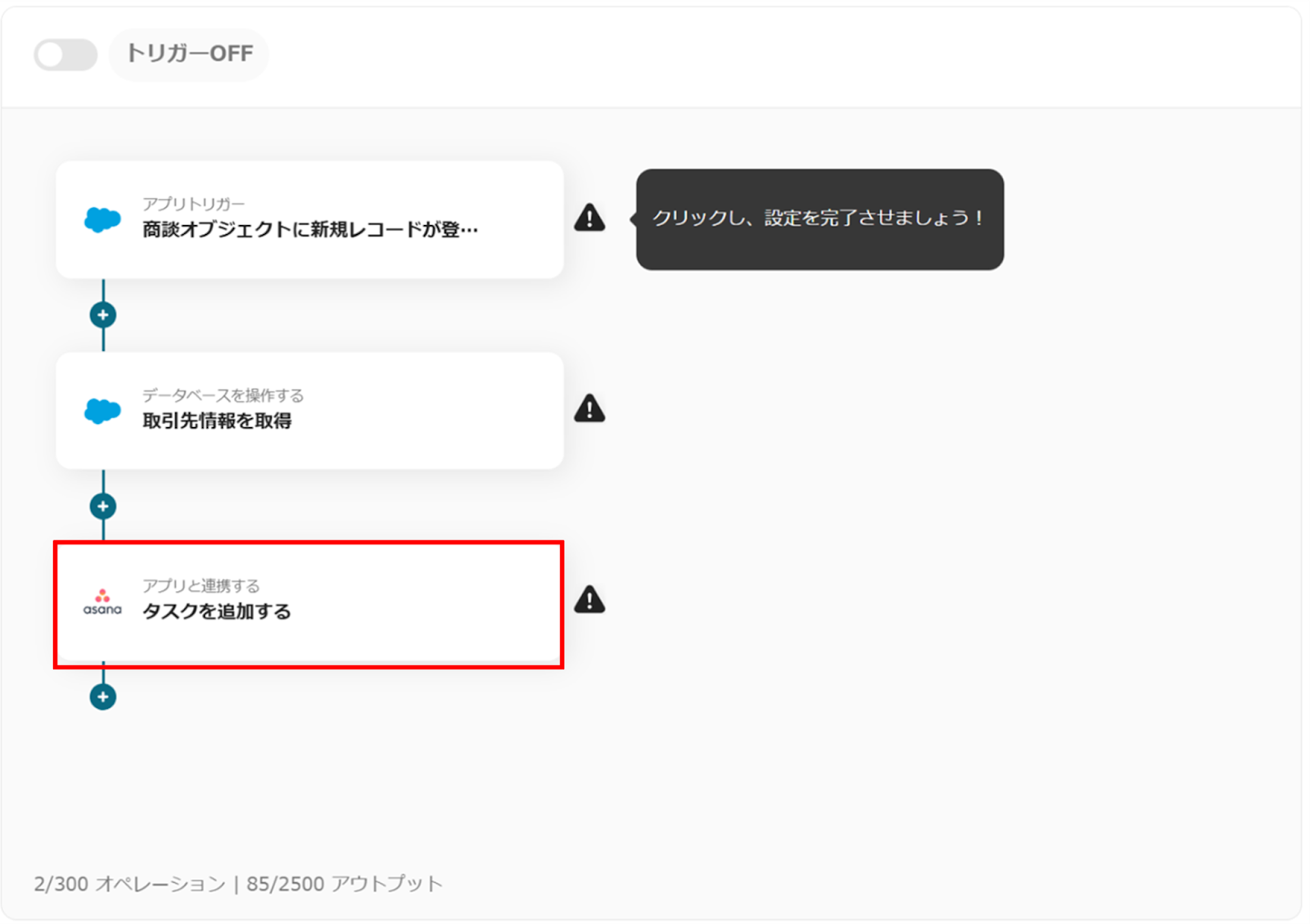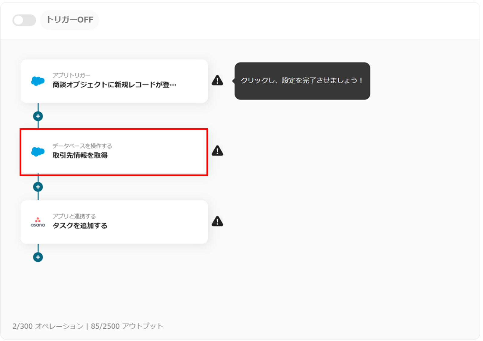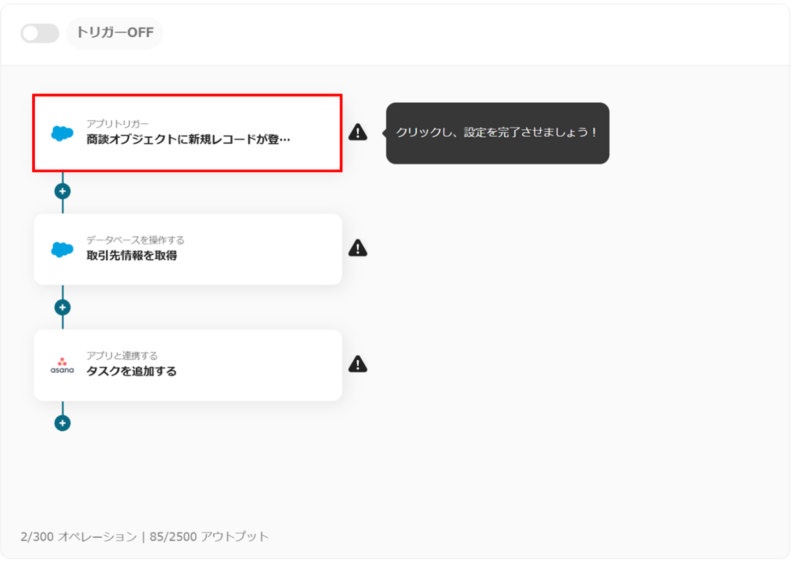 ※Salesforceはチームプラン・サクセスプランでのみご利用いただけるアプリとなっております。フリープラン・ミニプランの場合は設定しているフローボットのオペレーションやデータコネクトはエラーとなりますので、ご注意ください。