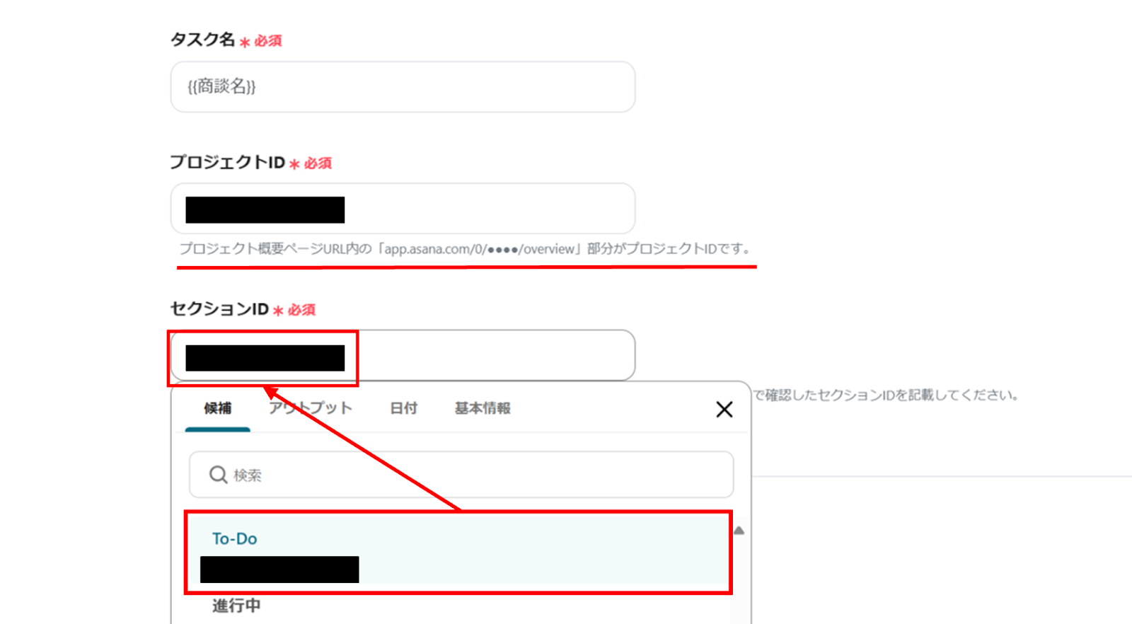プロジェクトIDとセクションIDは赤線を確認の上、候補から選択します。